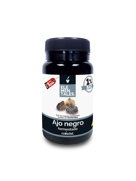 Ajo Negro Fermentado Elementales de Novadiet es un ajo envejecido que se elabora a partir de la especie, Allium sativum L. Presenta una mayor concentración de sus principios bioactivos, por lo que se le atribuye mayores beneficios para la salud, y un completo efecto cardioprotector, avalado por bibliografía científica, asociado a su contenido en S-alil-cisteína (SAC).