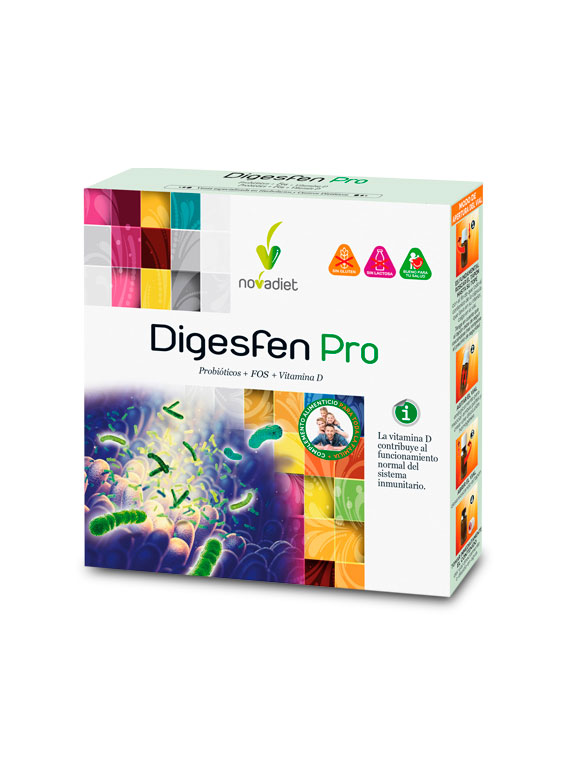 Digesfen Pro de Novadiet es un suplemento alimenticio para toda la familia con probióticos, FOS y vitamina D, la cual contribuye al funcionamiento normal del sistema inmunitario.